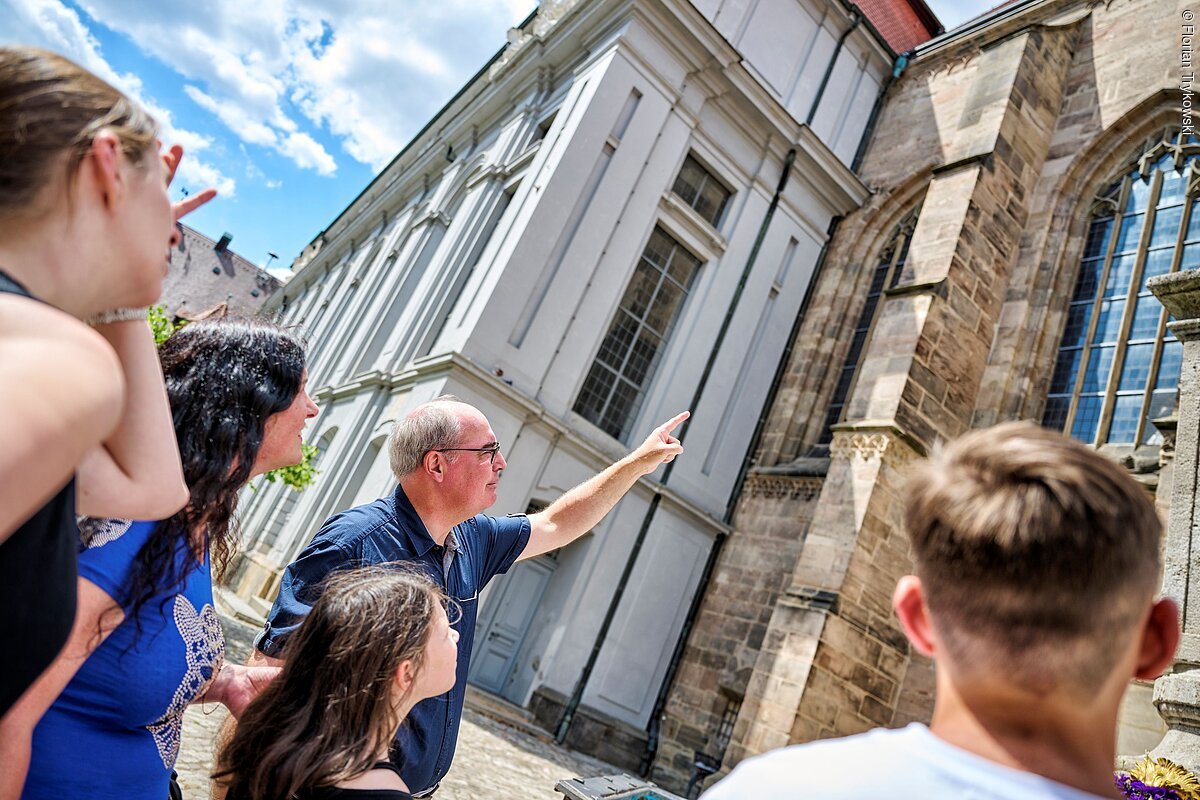 Wir besuchen die ehemalige Hofkirche St. Gumbertus, eines der Wahrzeichen Ansbachs, deren markante Drei-Turm-Fassade das Stadtbild prägt. Im Inneren beeindruckt der barocke Saal ebenso wie die monumentale Wiegleb-Orgel, die nicht nur in Gottesdiensten, sondern auch bei zahlreichen Konzerten, etwa im Rahmen der renommierten Bachwoche, zu hören ist.